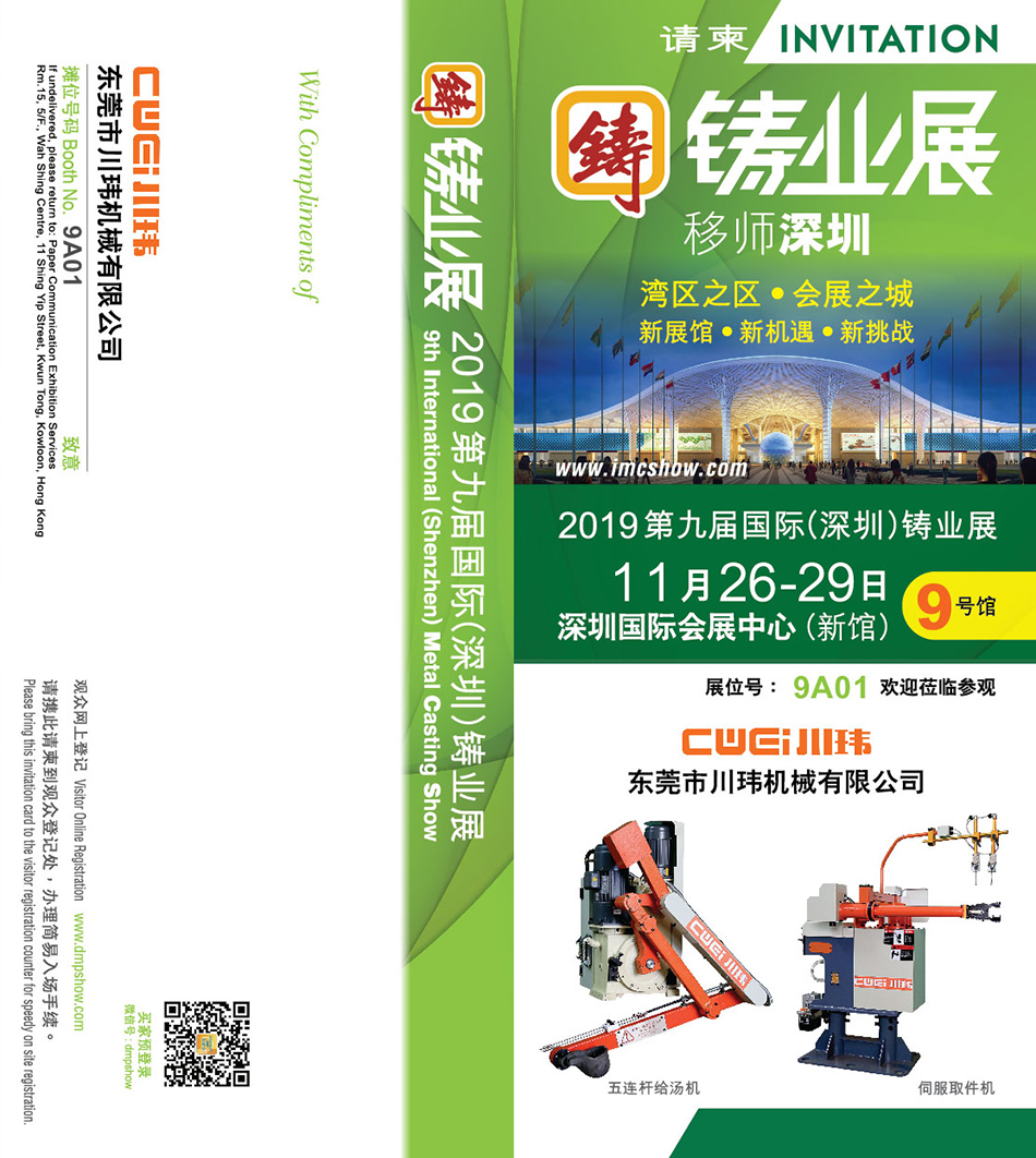 第9屆國(guó)際(深圳)鑄業(yè)展將于2019年11月26-29日在中國(guó)深圳國(guó)際展覽中心(新館)舉行!東莞市川瑋機(jī)械有限公司誠(chéng)邀各行業(yè)精英位臨參觀,展位號(hào):9A01